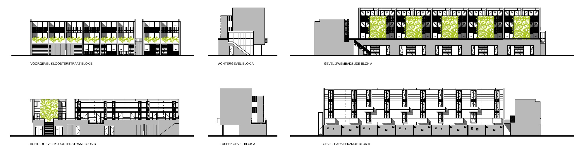 De derde kamer is de kamer van het parkeren: Iedere woning heeft zijn eigen parkeerplaats op eigen terrein. Hier is de gevel gesloten en bied deze privacy over en weer naar zijn omgeving. De setting is in behoudende grijstinten.