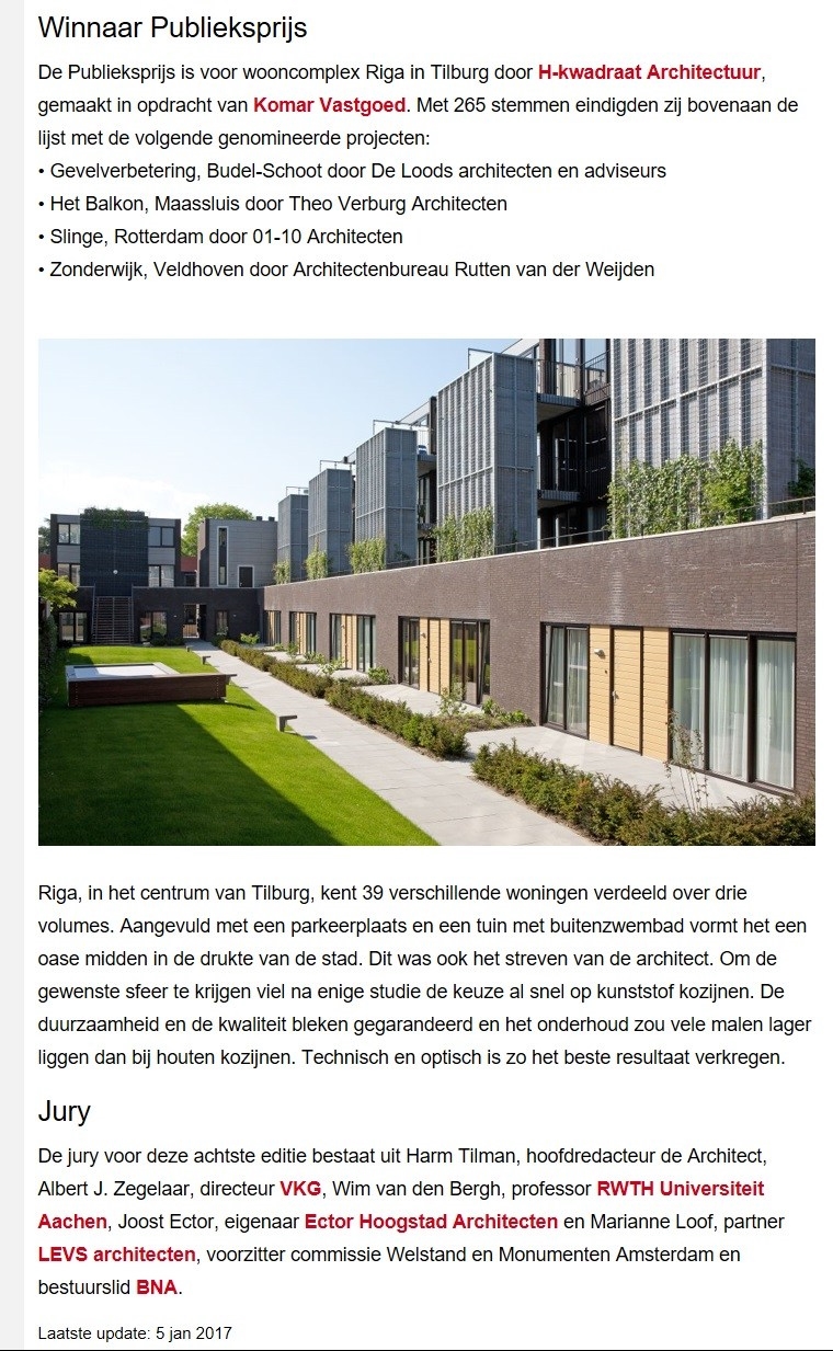 Riga is een complex bestaande uit 37 bijzondere woningen in diverse typologieën. Hartje Tilburg, parkeren op eigen terrein en zwemmen in een gezamenlijk zwembad in een geheel omsloten private tuin. Kortom een oase van rust midden in het centrum van de stad.
